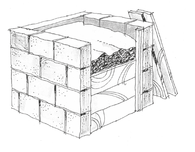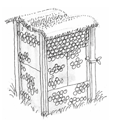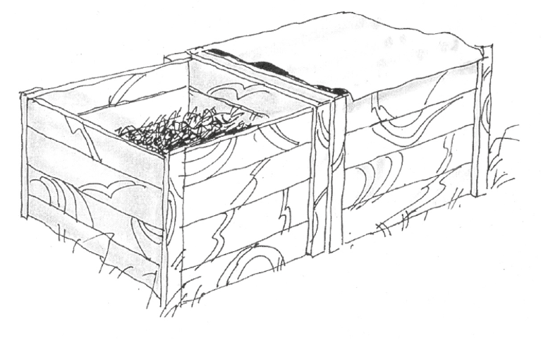 Cheap and easy to make. Drive four posts into the ground, then staple wire mesh to them. Make it easy to open one side for access. Line with cardboard cartons, and top with a plastic sack.